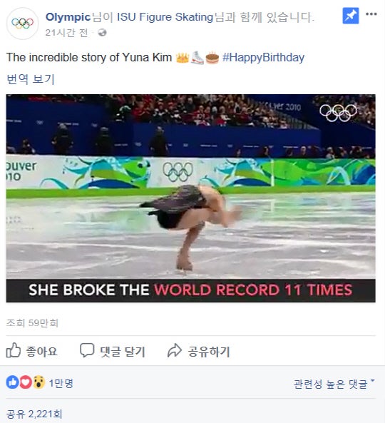 ¶ÇÇÑ °°Àº ½Ã°£ ±¹Á¦¿Ã¸²ÇÈÀ§¿øÈ¸ÀÇ °ø½Ä ÆäÀ̽ººÏ¿¡µµ ±è¿¬¾ÆÀÇ »ýÀÏ ÃàÇÏ ¿µ»óÀ» °ÔÀçÇß´Ù.